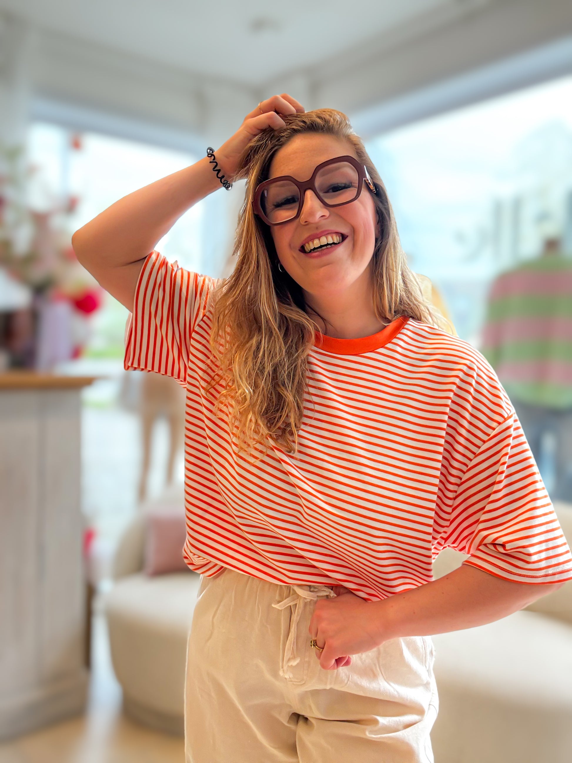 Losvallend T-shirt met fijne streepjes en een contrasterende hals.
